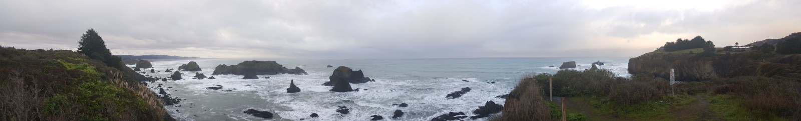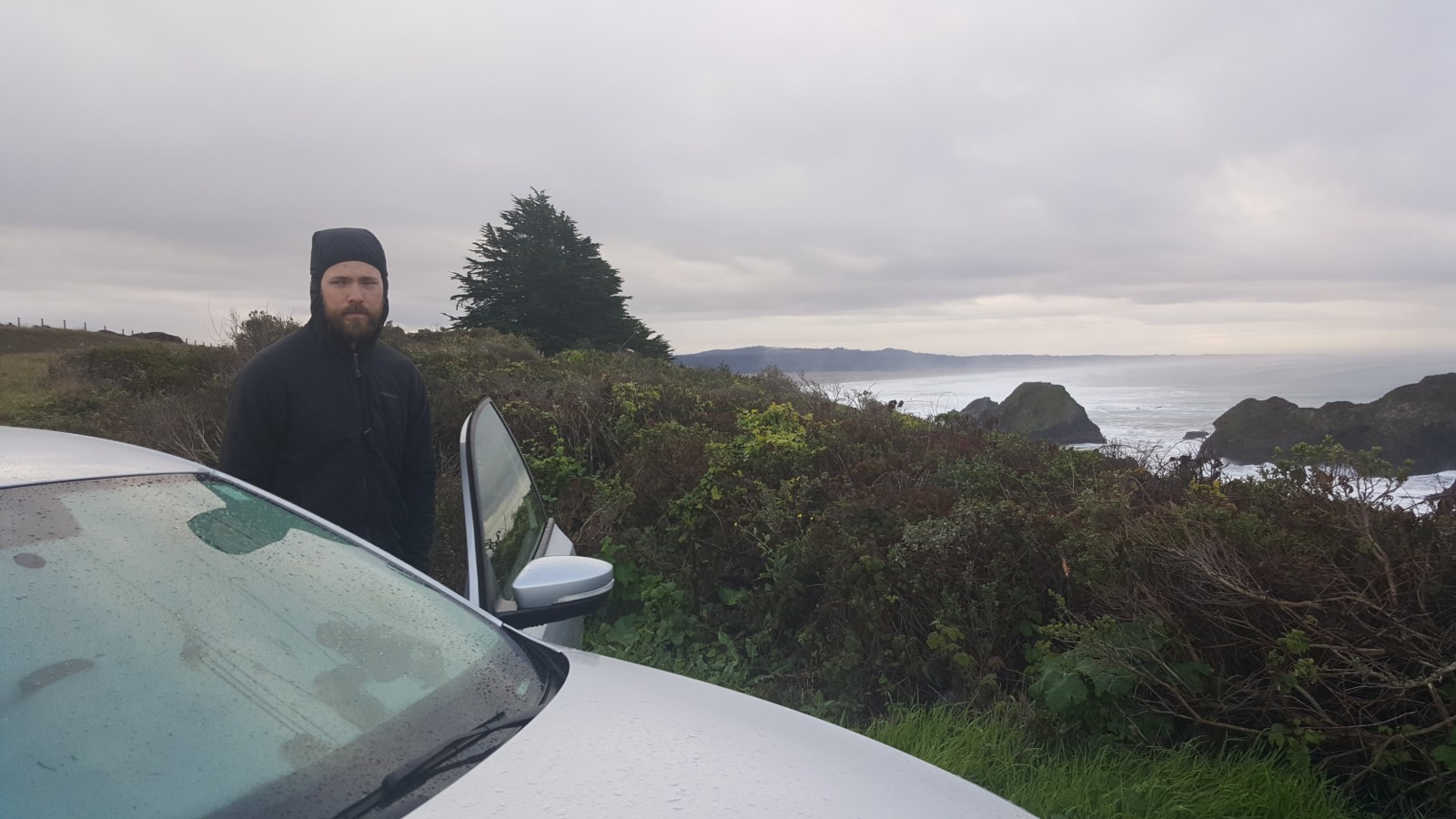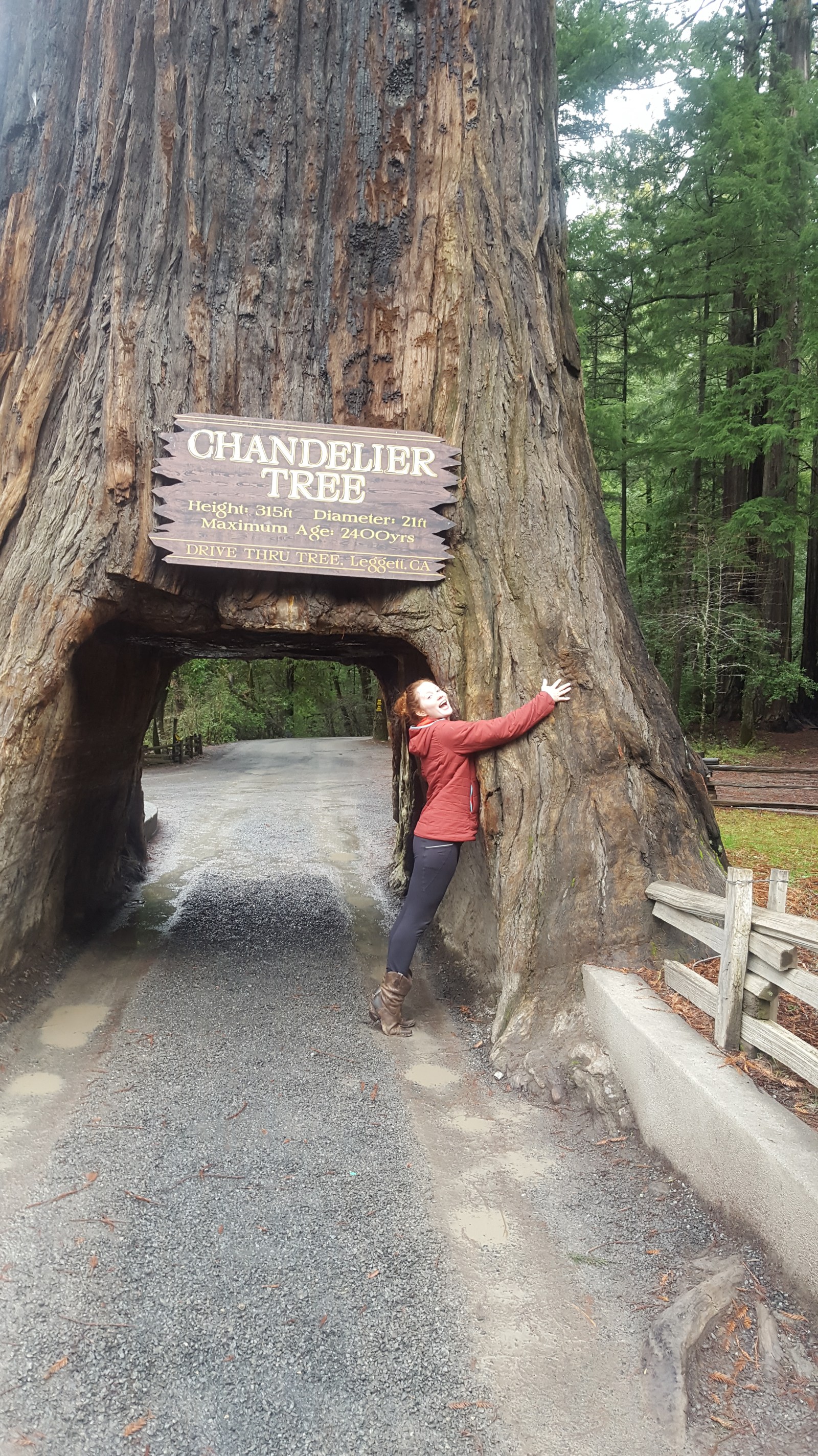 20170102_081818 Not wanting to leave, we back tracked to the nearest town to grab a bite to eat then quickly turn around to continue driving north to see the Redwood forest. As we were driving back past our cliff camping spot, someone was parked in the lot taking pictures. We had avoided the tourists! 20170102_081732 The road immediately took us into the surrounding hills and popped us back to the ocean side often. The roads we were driving on last night held many treasures that would could now see in the day light. We had been passing through thick forests of the largest trees I will ever see in my life. Dotted here and there, these ginormous trees loomed above us to cover the road in archways with their branches. Some trees even caused the road to quick turn to go around the trunks. This post will be mainly pictures because there are so many cool shots I want to share. We never went to the National Redwood Forest because the trees were everywhere along the highway and we found ourselves in places where there weren’t a lot of people. 20170102_103149 The weather was terrible. When I say terrible, we literally had every kind of weather you can image happen to us on this day. Sunny, cloudy, windy, not windy, cold, hot, rain, sleet and snow. I joked about what can happen next and it instantly started hailing. WHAT?! The roads we traveled led us through small towns and tourist traps. But, one in particular was exactly what I was looking for. I wanted to drive through a tree and we did precisely that. I couldn’t see anywhere near the top of the tree and the branches grew out, turned directly 90 degrees and continued growing upward. The thickness of this ‘branch’ was exactly the size of a full grown tree. How in the word does this tree support all of the weight!? 20170102_120131 20170102_114452 Chad and I detoured through the Avenue of the Giants, saying that this would suffice for not going into the actual Redwood Forest. The trees are nothing special, they look like any other regular tall pine tree you would see up north. But the sheer size of the average tree trunk was bigger than the length of our Diesel Jetta.