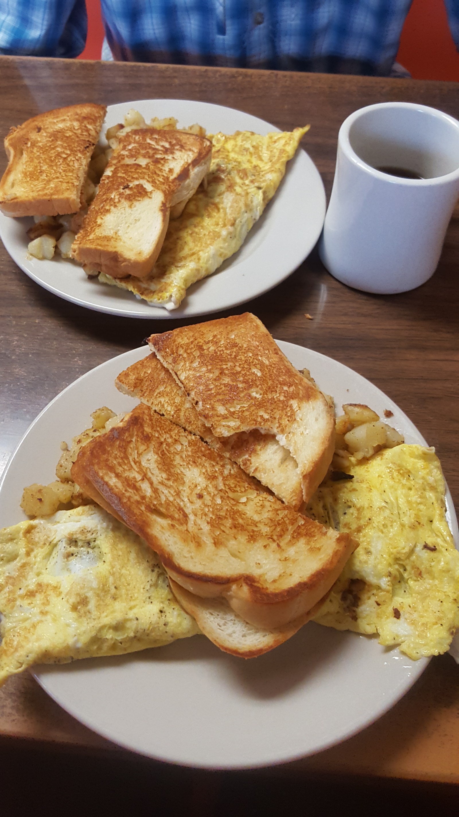 We parked across the street at a little dinner in the small town and ordered up two omelets. Chad had the Western (bell peppers, onions, mozzarella) and I had the steak and cheese omelet. Super tasty (Chad’s was the winner).