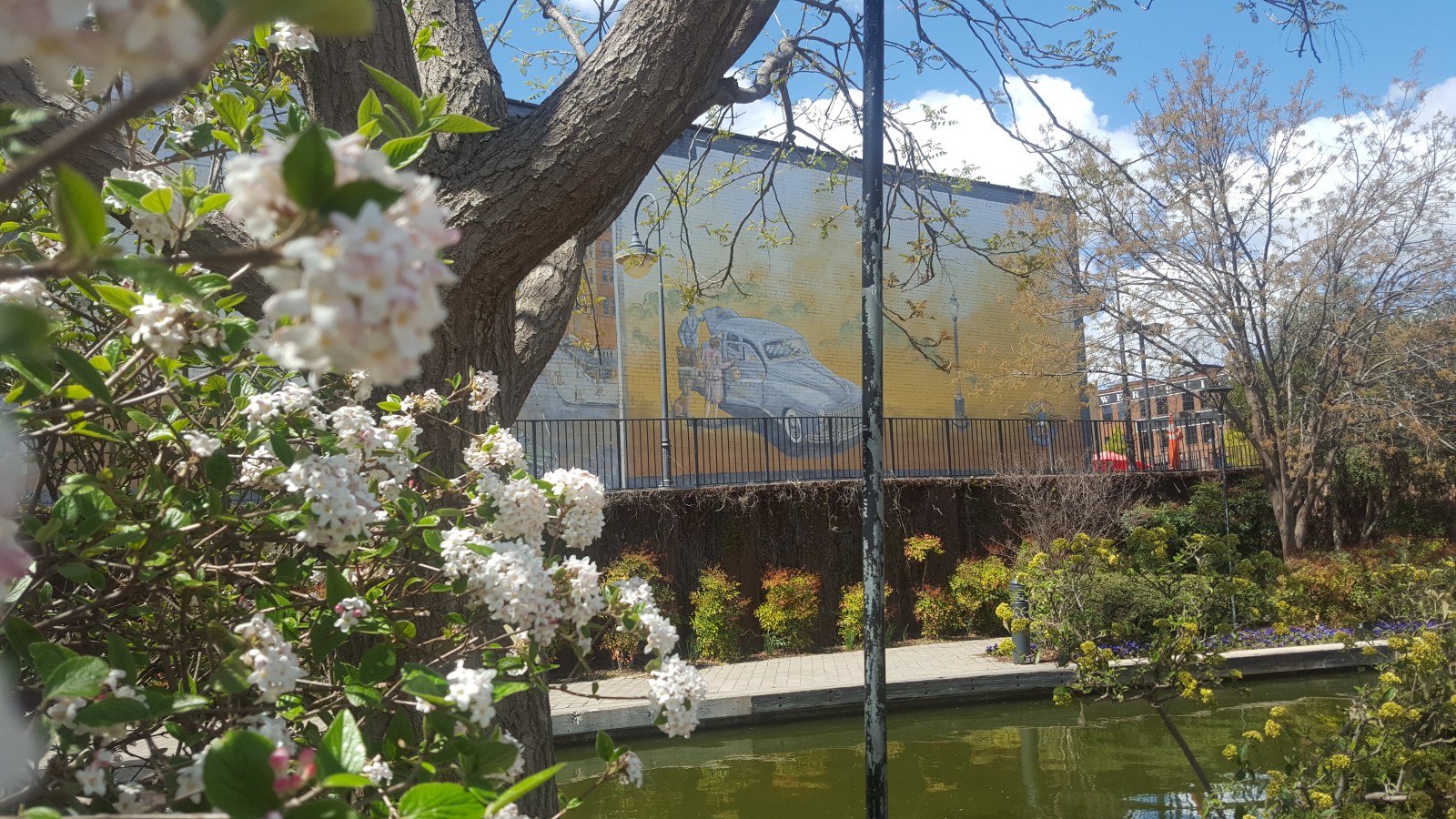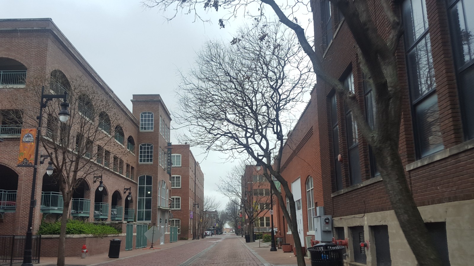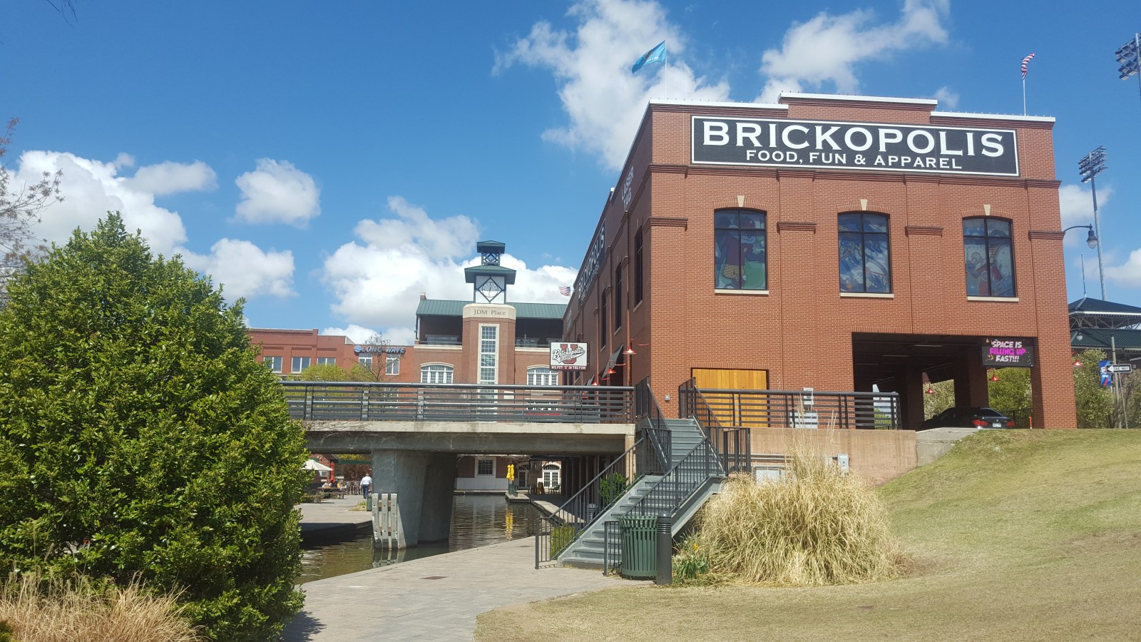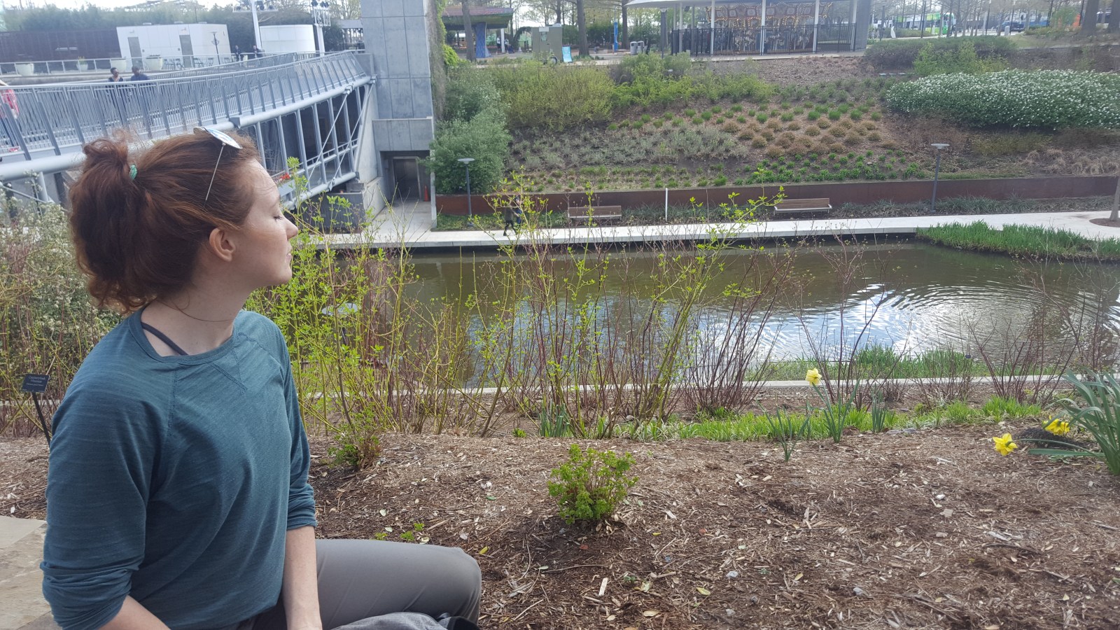 Katie finally gets to go on a backpacking walk! Because it’s nice outside, a balmy 70 degrees, we are wicked hot. Following a little water canal, that led us through a very scenic setting with brick buildings lining both sides of the water. Shops, cafes, restaurants, a movie theater, Sonic Headquarters, mini golf and canal boat rides are just some of the places that littered the walk.