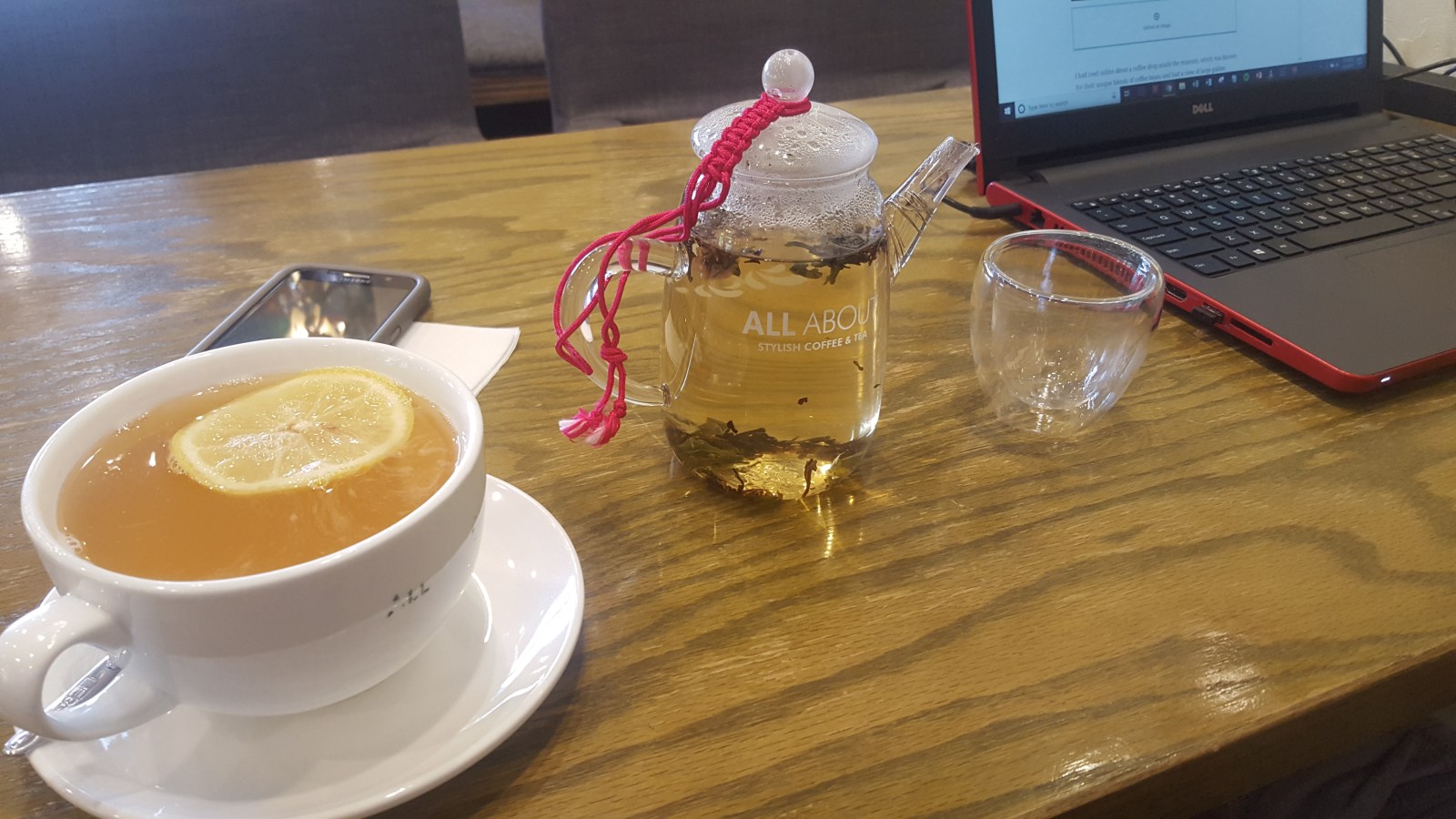 Our mission was to find a coffee shop to make some adjustments to the blog and get the lay of the land. We hunted all throughout the Bricks and finally came across All About Cha. The “Coffee is cheaper than therapy” window cling said it all. Once inside, we realized it was a Korean tea and coffee house with options for all varieties of drinks. (if you wanted food, you could have yummy looking sushi rolls and breakfast dishes). SUPER awesome tea.