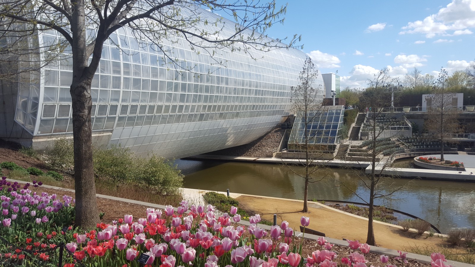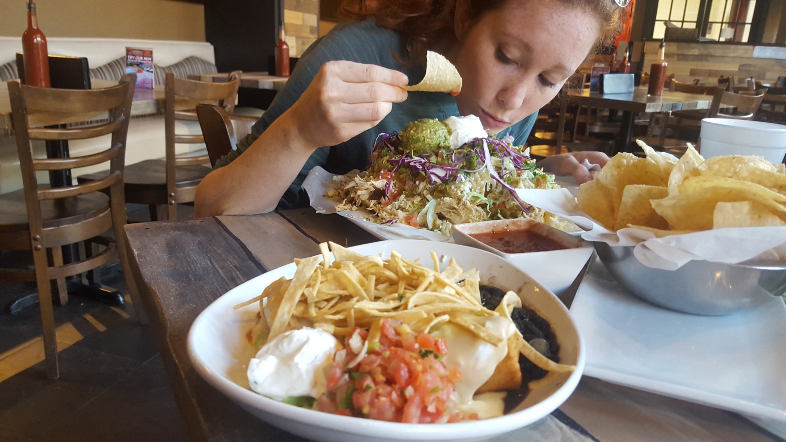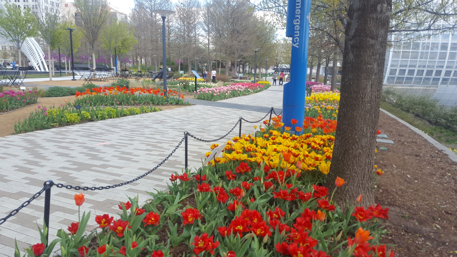 The walking led to greenery and we found ourselves in a botanical garden. There were little flowers and color everywhere! Now we are hungry for some sustenance; the only food we have had today has been the left-over carrots from dinner and tea. Back in Bricktown over the canal, here was a taco place. Man, were the nachos and chimichanga good!