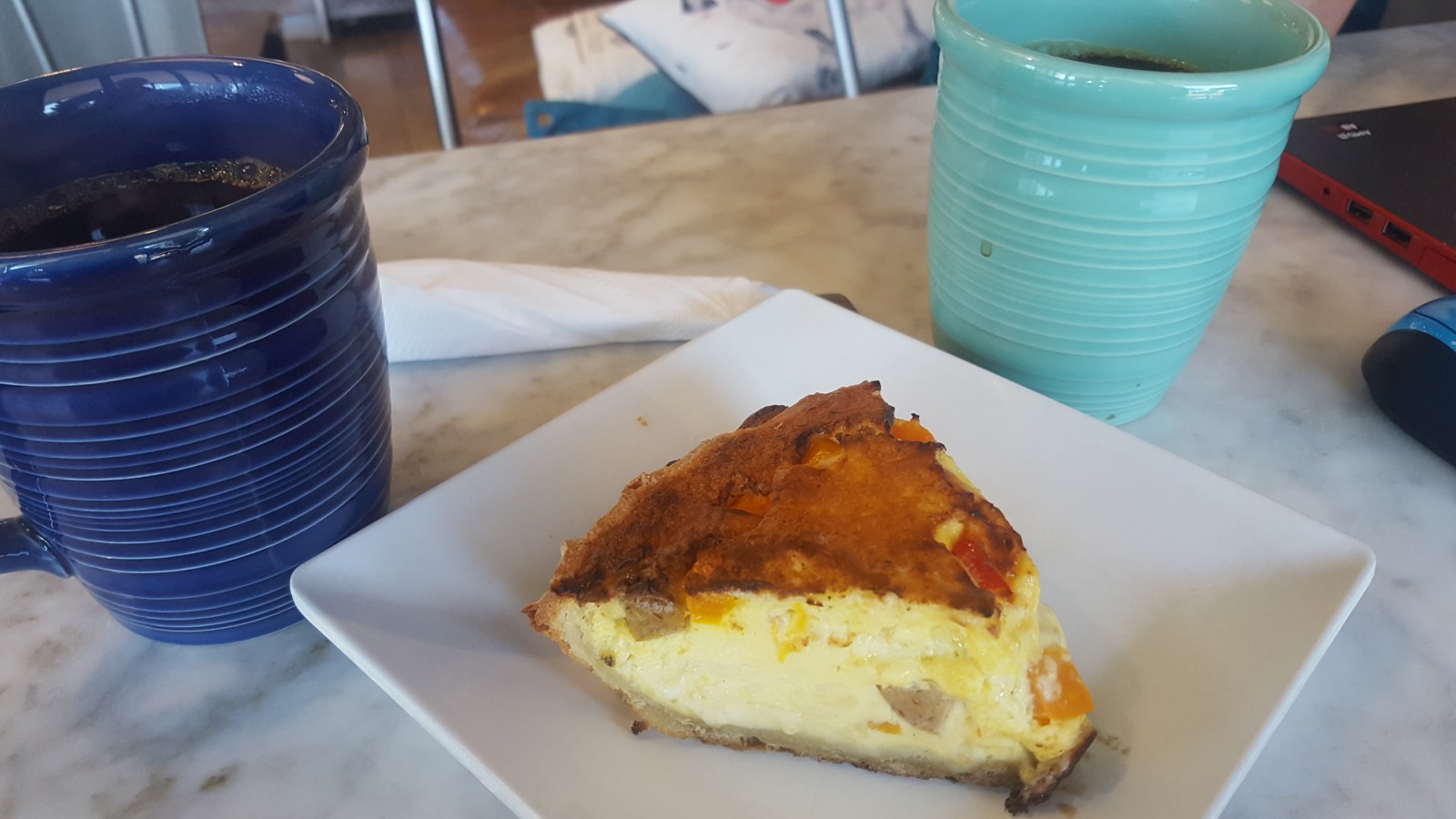 Pleasantly awake, we tootled to a local café which happened to specialize in gluten-free bakery items too. I set up shop and Chad came back with a slice of bell pepper quiche and two cups of black coffee. Oh, the quiche went down so fast.