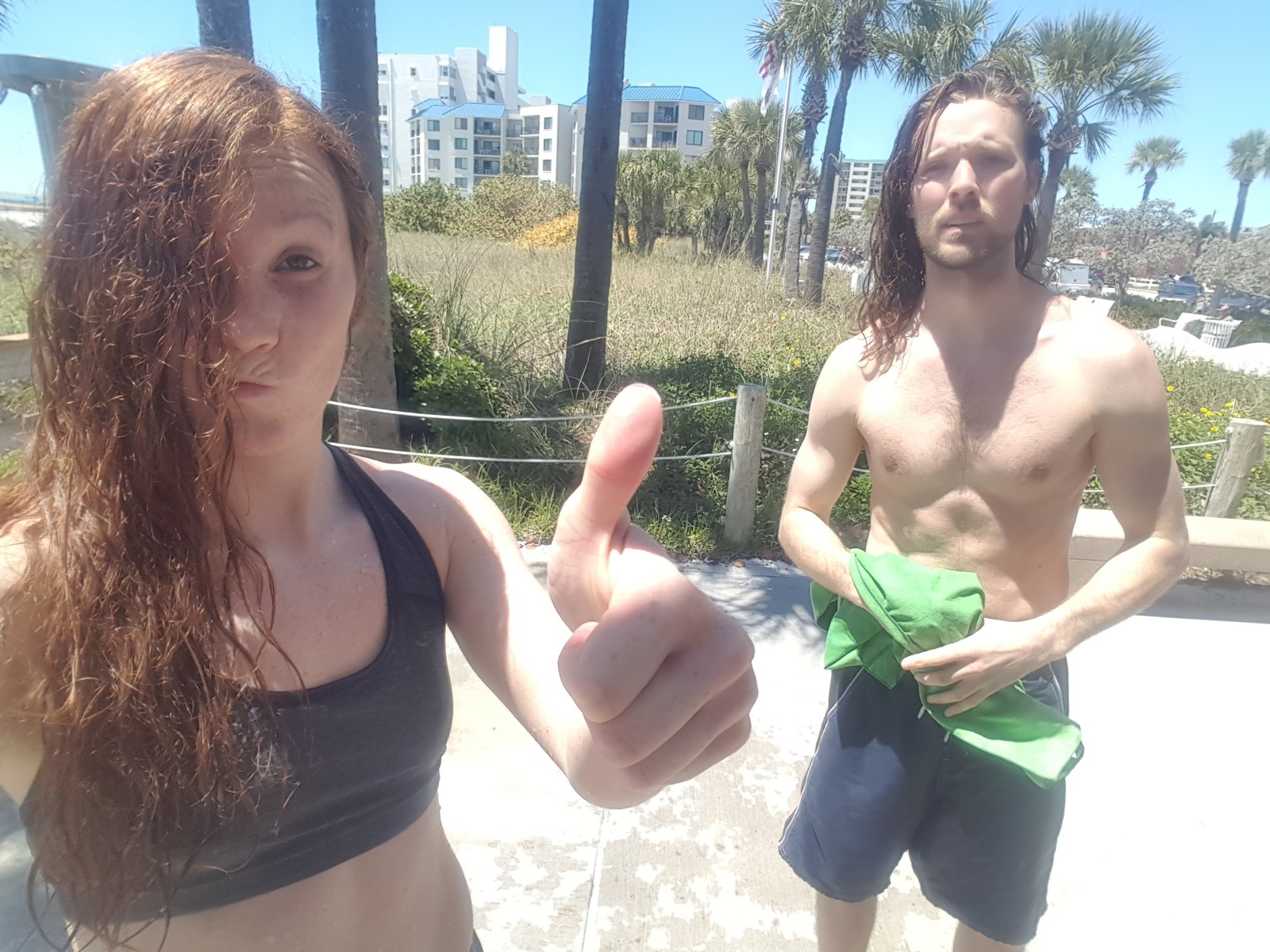 But first, a run on the beach.  It was midday (oops…. like the hottest part of the day and notably terrible for getting sun burned easily) and I lathered up in 50 SPF sunscreen, shorts and a sports bra.  Chad opted to skip SPF for now since his skin isn’t as sensitive as mine and dawned running shorts. Time for barefoot running!