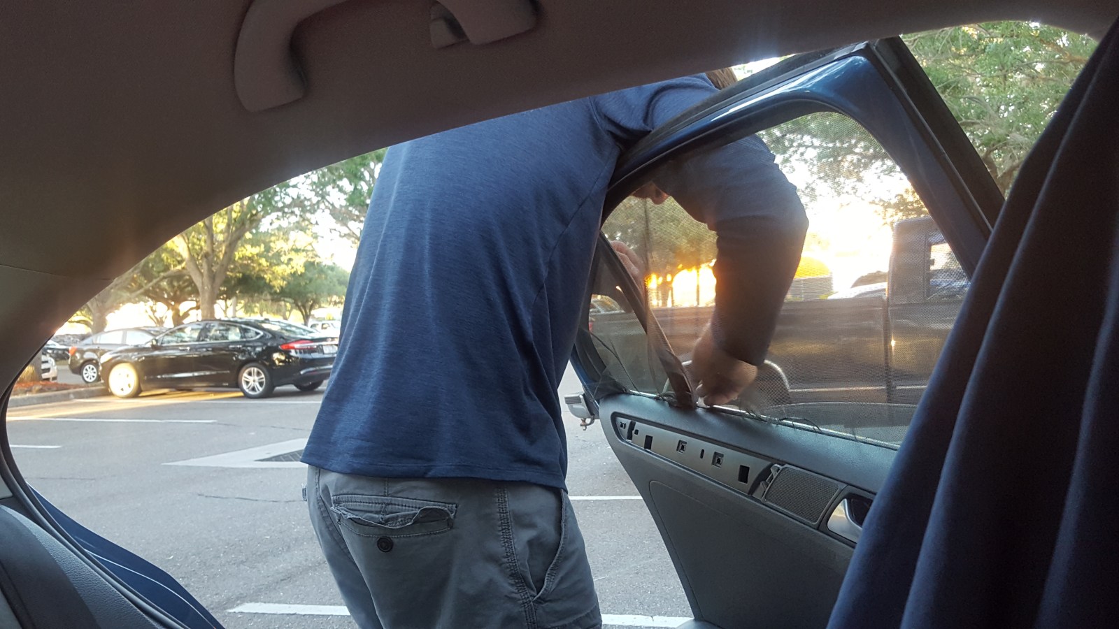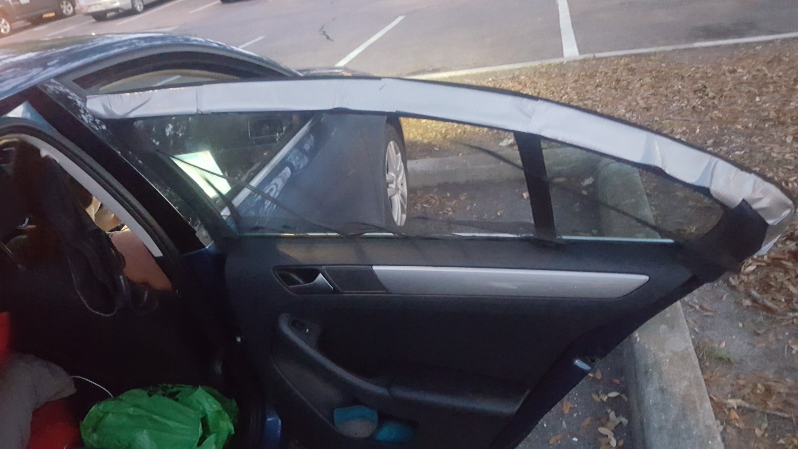 Window B:  the bug screen is adhered to weather stripping around the entire window with duct tape.  The duct tape is not visible from the exterior of the car.