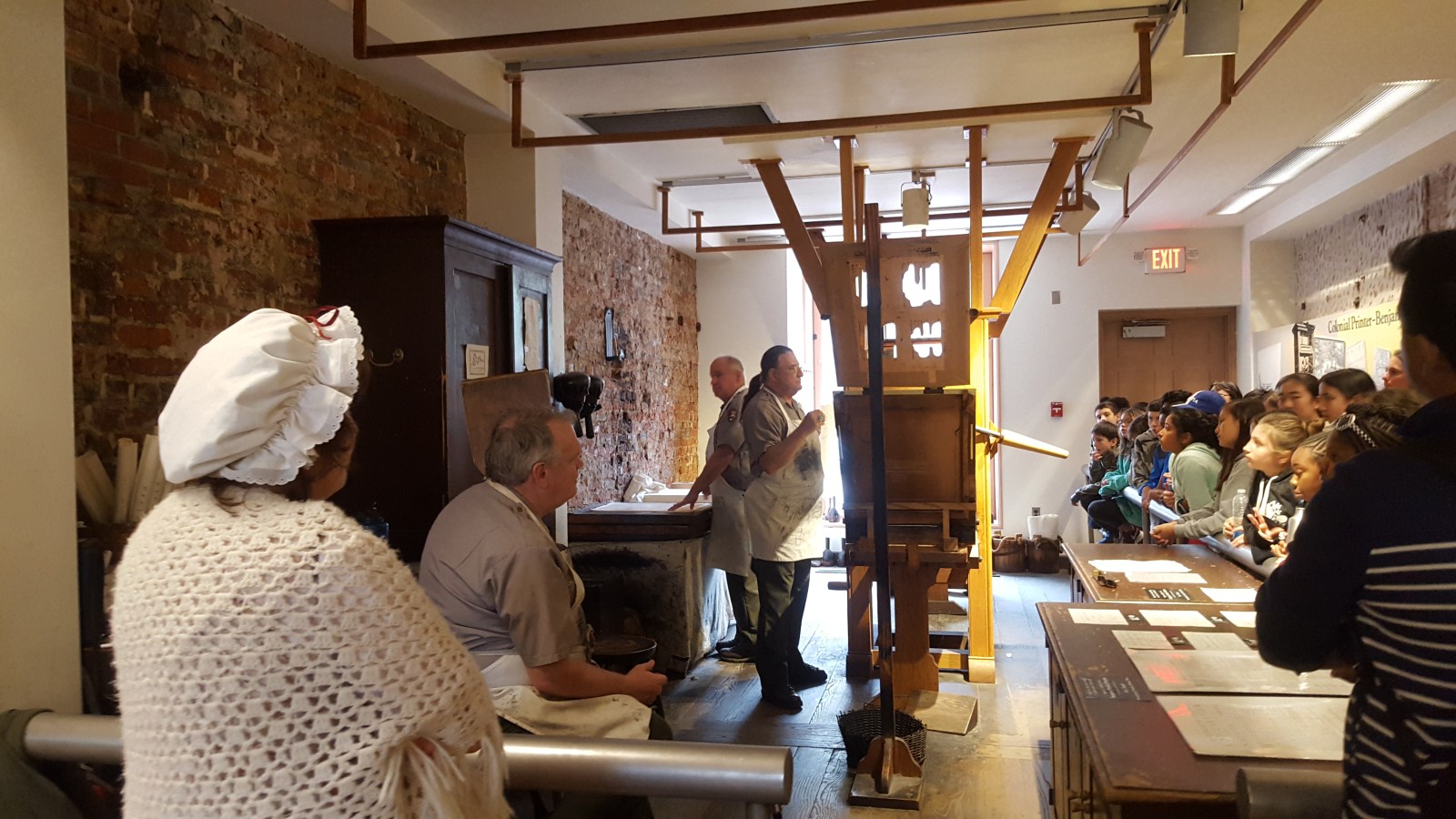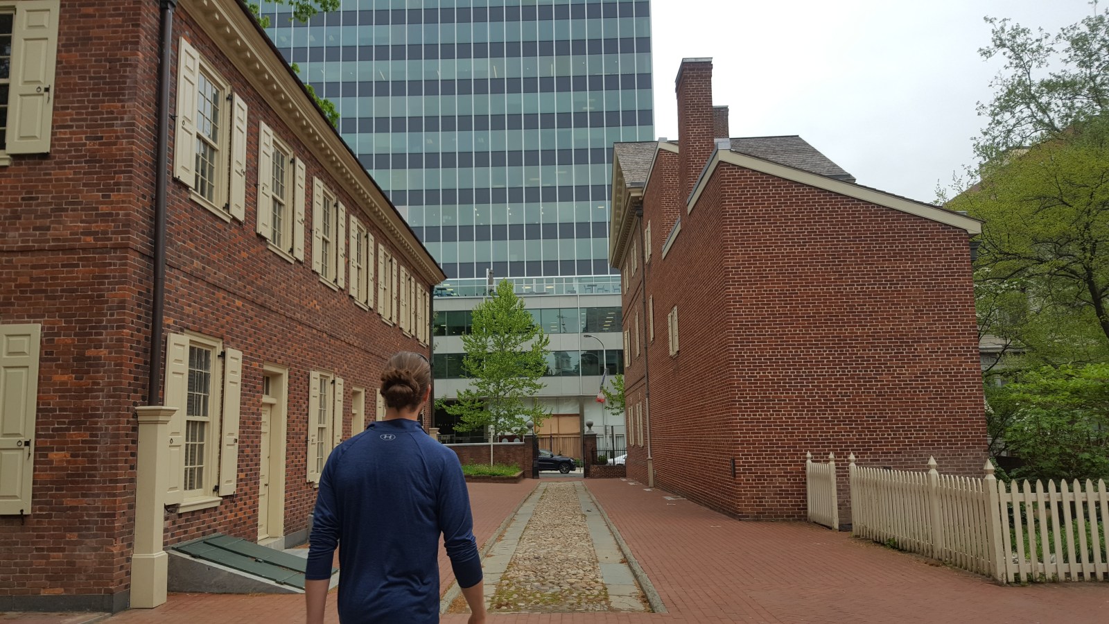 Chad remembered there was a Ben Franklin home to investigate and we were able to walk into his home space, see a printing press demonstration, look at the old home construction and learn a little about his life. The ink beaters looked like massive punching gloves on sticks and would cause a large ‘blotchy’ mark on your cheek, if hit. 😉