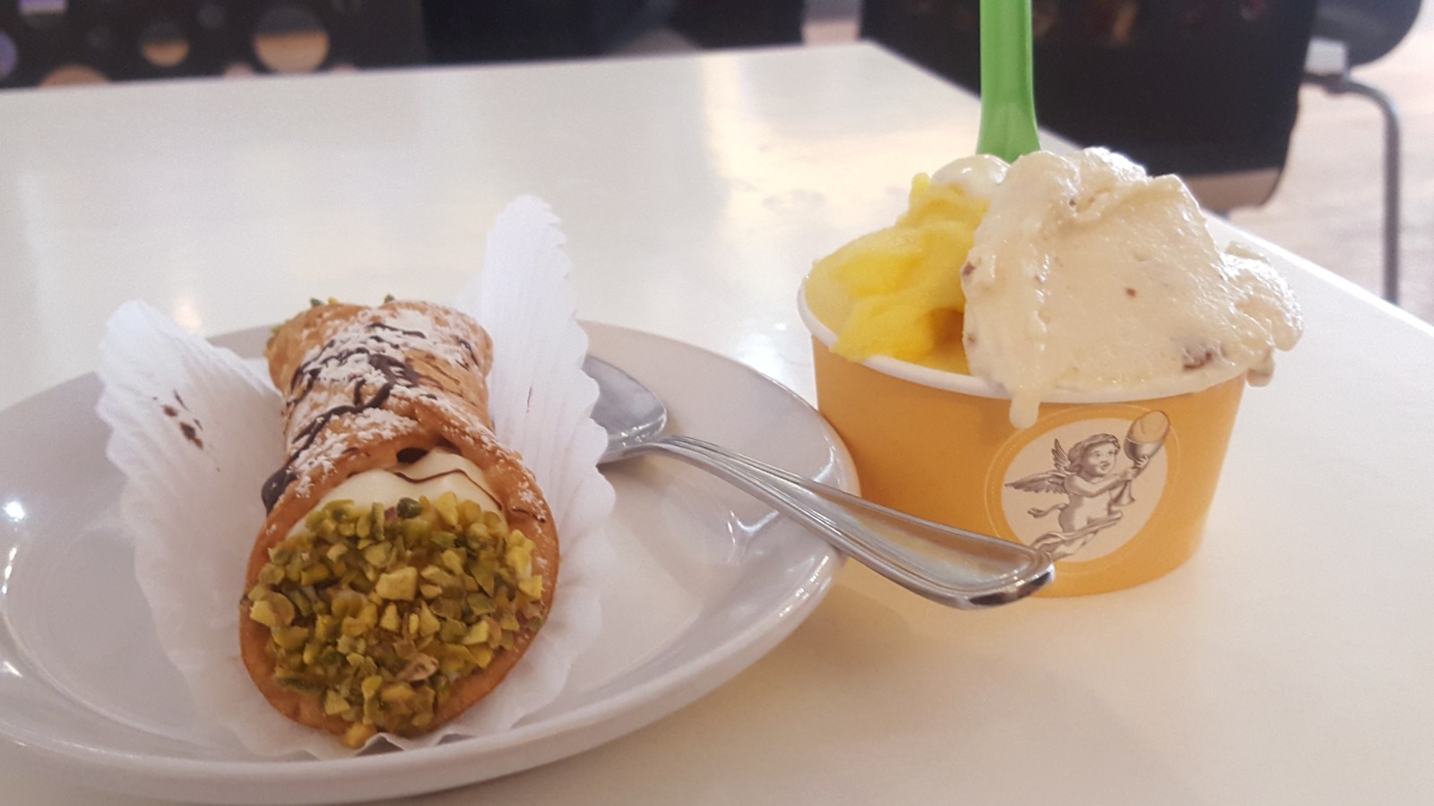 Ordered: Pistachio cannoli and gelato (mango and pecan)