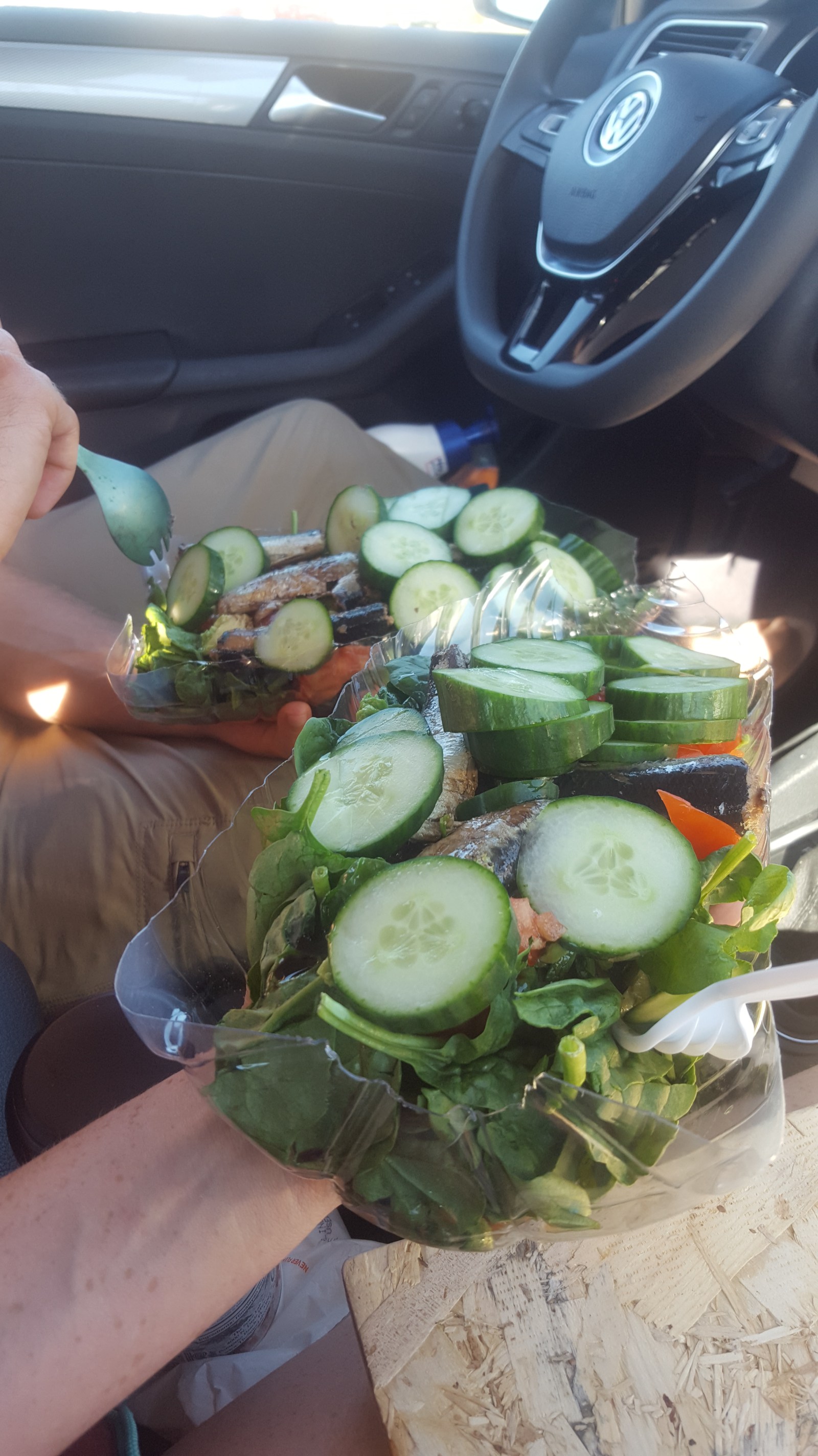For a late afternoon lunch, we swung by the local grocery store and gathered ingredients for another round of massive salads. This time, Chad went for two cans of sardines and I stuck to one. After about 15 minutes, our jaws were tired of chewing the veggies and it’s basically a marathon to finish the entire thing.