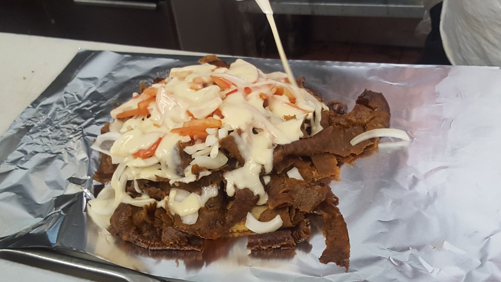 Chuckling, he wished us well. We ate the sandwich in the restaurant and filled our bellies. It was a completely different flavor than the lamb gyros. The beef was spiced, still sliced thinly and topped with onions, tomatoes and their special white sauce. The sauce tasted like a sweet Italian dressing and it complimented the meat well. YUM.