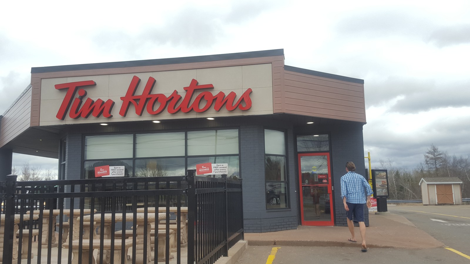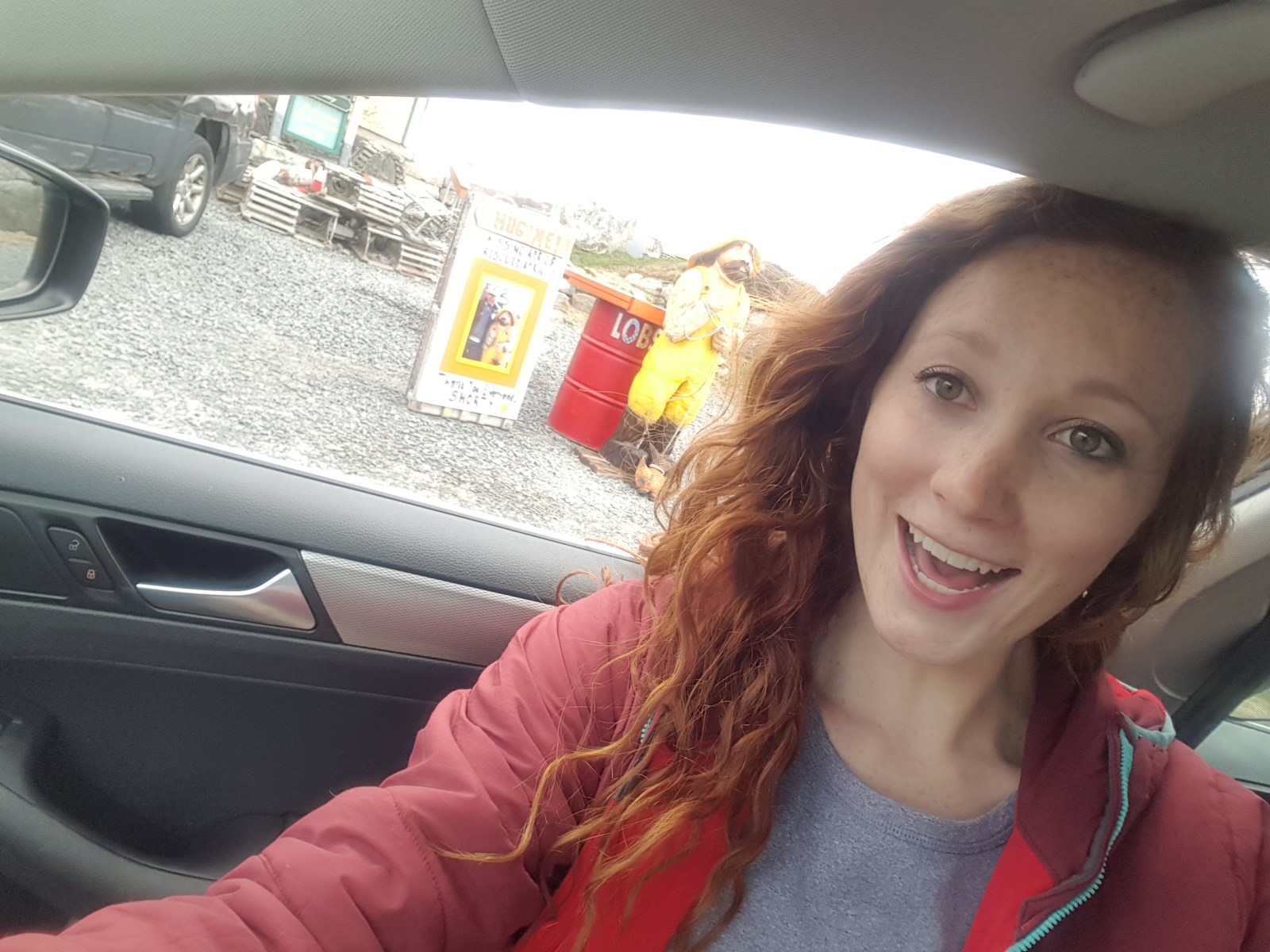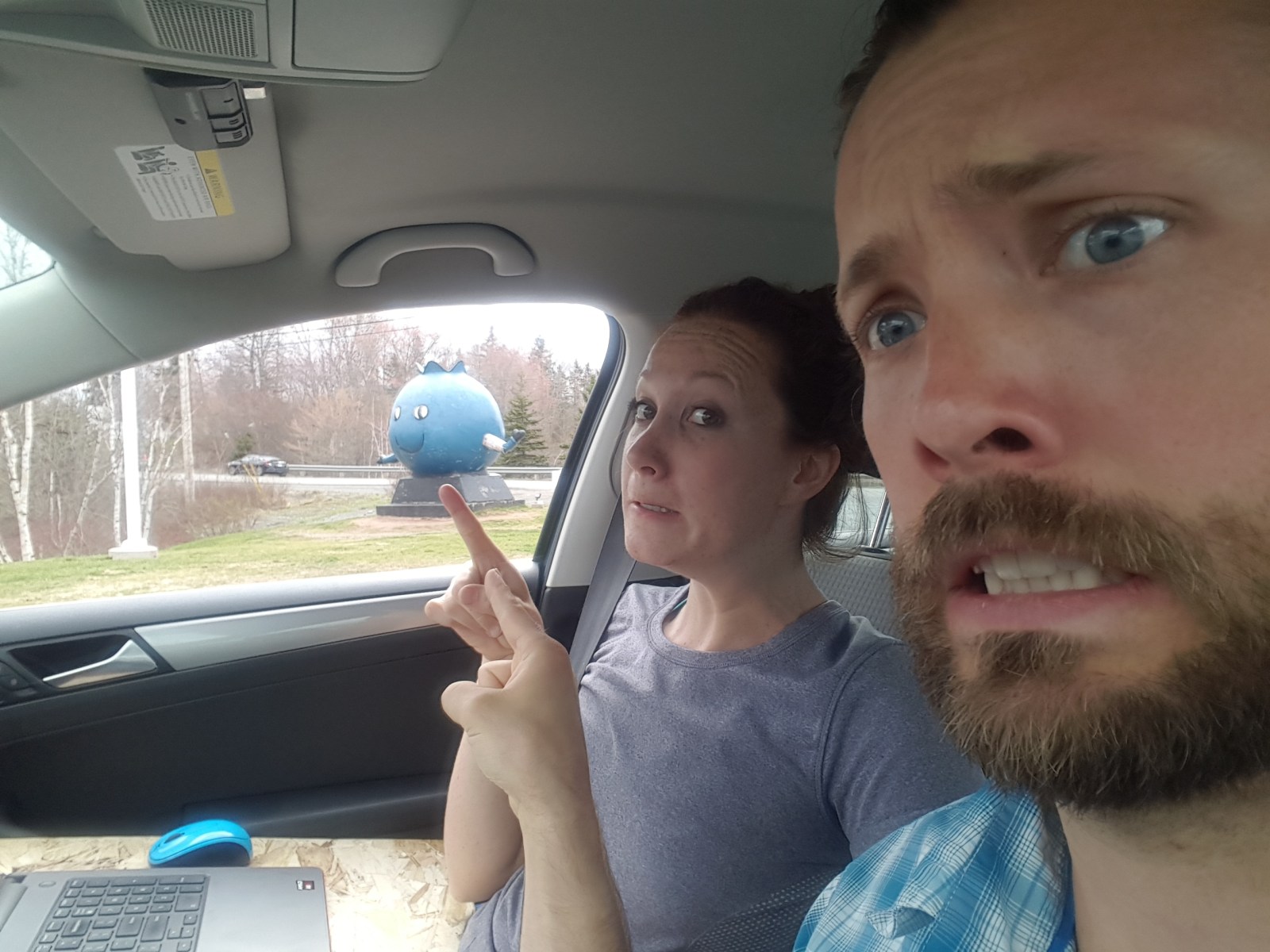 Stretching our legs at a Tim Horton’s (first time on the Canadian trip), we tried their drip coffee and the apple London fog tea. YUM, the team was awesome. Coffee was kinda generic coffee. There was a giant blueberry statue that we took a selfie with from the within the car!