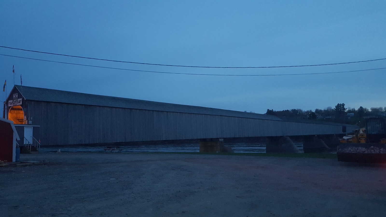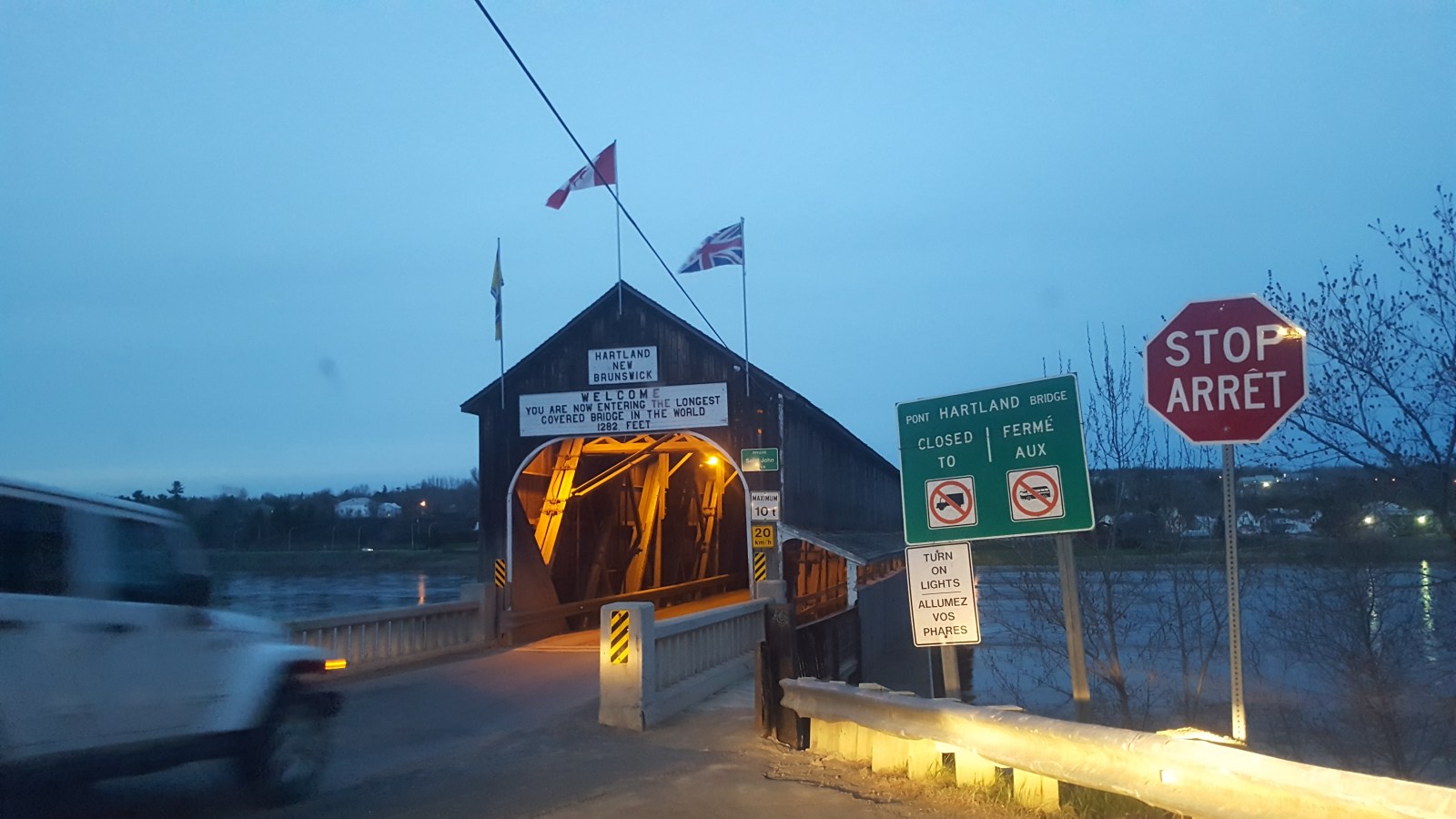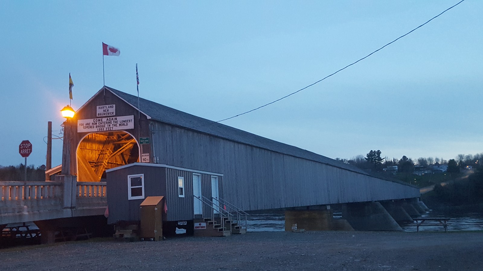 Towards sunset, we drove by a town that claimed to have the World’s Longest Covered Bridge. Why not see it quick? Turing off towards Hartland, New Brunswick we drove about 7 kilometers into the small town.