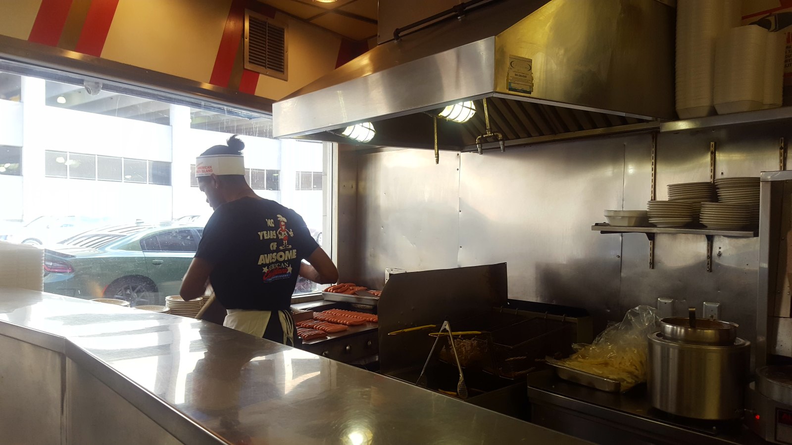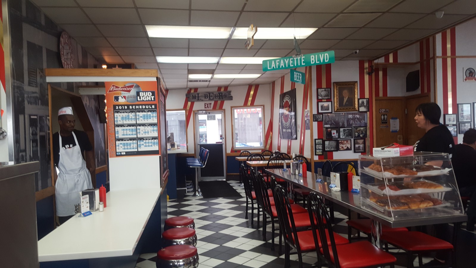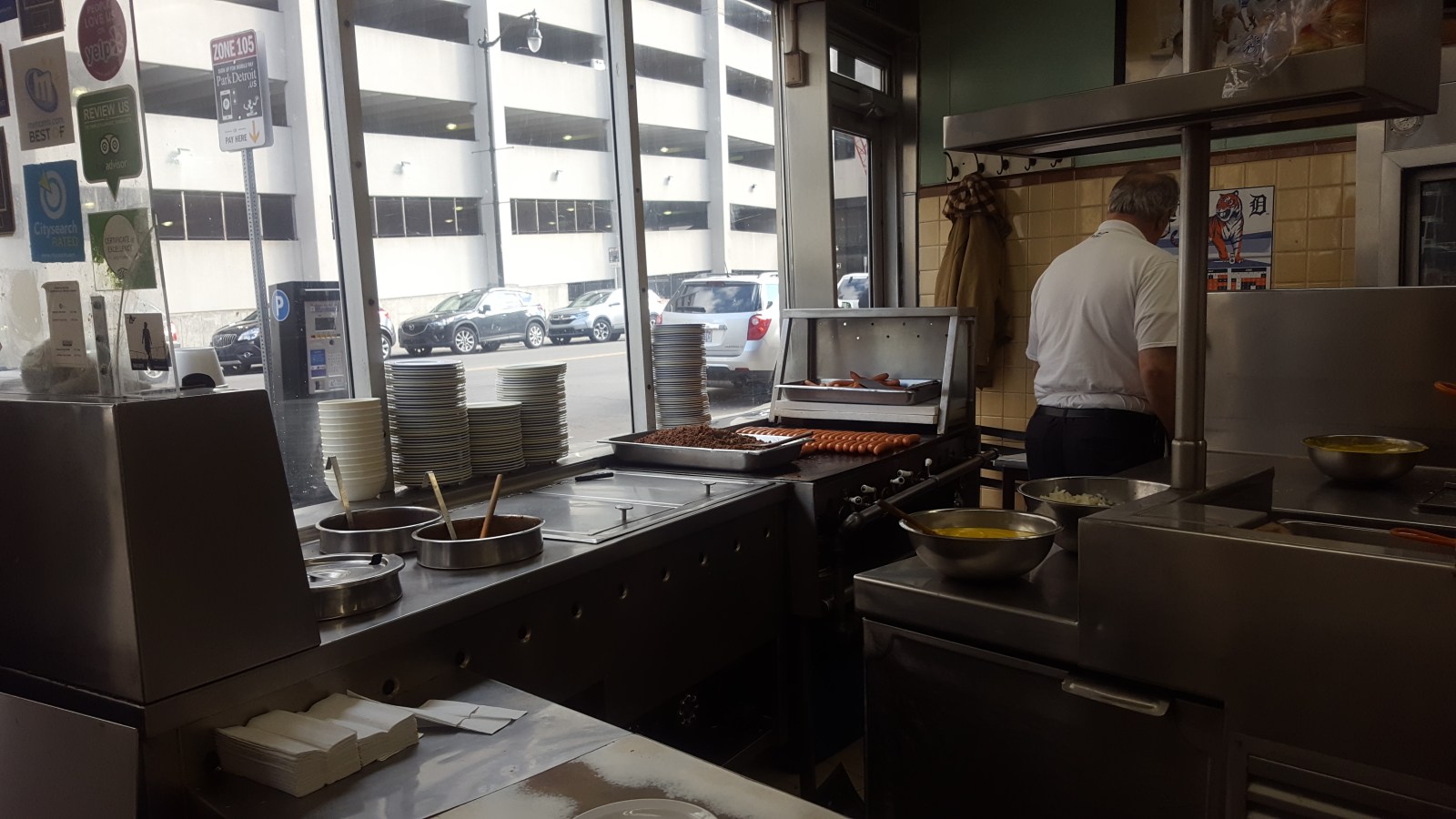 We made it back into the U.S. with no issues! The boarder patrol guy was SUPER chill and told us he saw a brown bear in Virginia, Minnesota on his first day there for a job interview. Wow. On to hot dogs! After looping around the block and not seeing parking, Chad parked in the 15 minute parking and I hopped out to get two hot dogs. One from the original Coney hotdog restaurant 'American Coney Island' and another from the fall-out brother’s restaurant 'Lafayette Coney Island'.