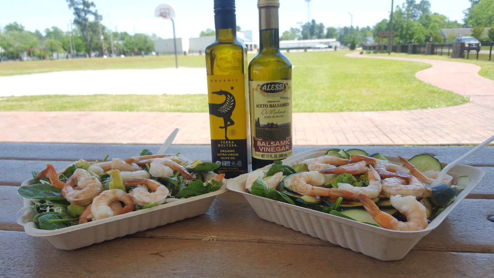 Pictured: Spinach, shredded cabbage, avocado, cucumber, shrimp, vinaigrette, and olive oil.