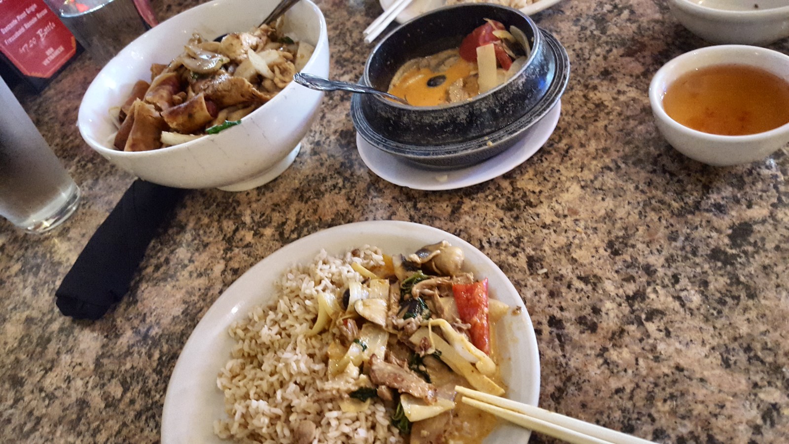 Finishing in a large walking loop, we packed up the car and drove out to have dinner at the 888 Pan Asian Restaurant. Chad and I had stumbled across this place during lunch for an all-you-can-eat $10 lunch special when we came to Austin back in October for a long-distance rifle shooting class (side story at the bottom). We tried the panang curry and duck as well as the lemongrass vermicelli noodles with chicken. NUMMY.